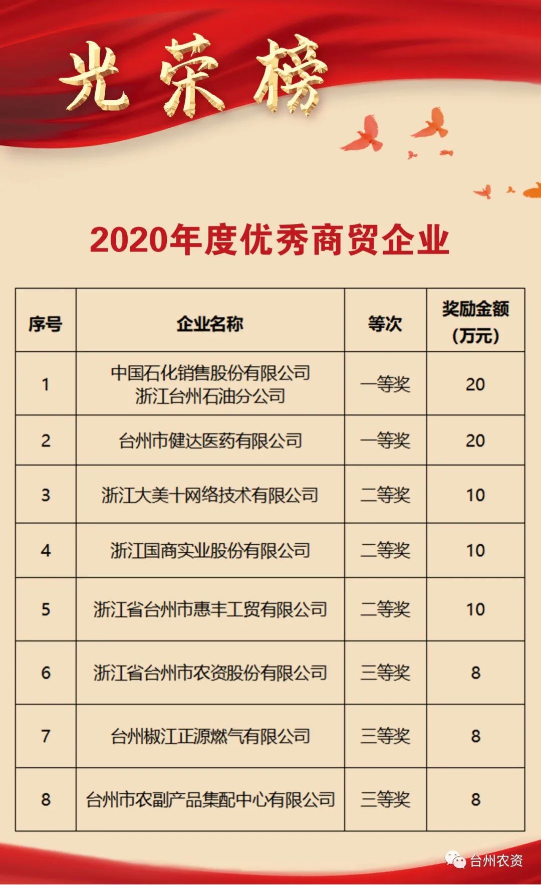 喜報(bào)|臺(tái)州農(nóng)資榮獲椒江區(qū)2020年度優(yōu)秀商貿(mào)企業(yè)、農(nóng)業(yè)生產(chǎn)綜合發(fā)展獎(jiǎng)、新型農(nóng)業(yè)經(jīng)營(yíng)主體培育獎(jiǎng)